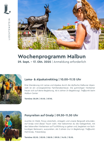In Liechtenstein, autumn is an experience for the whole family: from 29 September to 17 October, the autumn week program in the mountain region ensures unforgettable vacation moments. With llama and alpaca trekking, guided e-bike tours and pony rides, an adventure awaits every day.