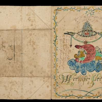 The exhibition traces the history of love in writing, from its early literary forms through the 19th century to the digital messages of today. A moving letter from 1844, tender exchanges of postcards, artistically designed love notes, and literary works demonstrate how people remained connected across great distances.