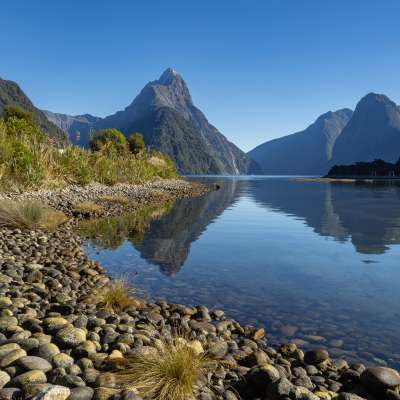 The South Island is characterized by the central Southern Alps mountain range, which rises to a height of 3,700 meters, and lonely roads along the wild, rugged west coast. The huge Fiordland National Park captivates visitors with its forests, lakes, and fjords, or sounds, as they are called in New Zealand. Gentle bands of clouds drift over the sloping highlands on the east coast with their vast herds of grazing livestock, and over the Pacific coast with its dolphins and whales.