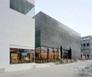 Exterior view of the Liechtenstein Art Museum with modern façade and café terrace in Vaduz.