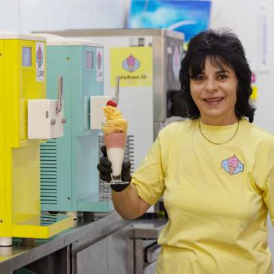 The delicious ice cream specialties from the ice cream bar are available either freshly prepared in the ice cream garden or frozen at any time in the self-service store.