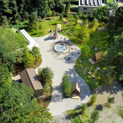 The Waldhotel family park in Vaduz offers a peaceful environment for play, fun and relaxation. A large fountain, various play equipment, a barbecue area and cozy picnic houses invite families to spend time together in nature.