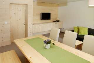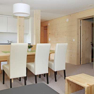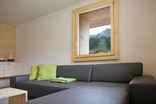 The apartment has a double room and a room with a double bed and a bunk bed, making it ideal for families of up to 6 people. The apartment has a spacious living/dining room, a large bathroom with WC and shower, a checkroom, a balcony and a seating area. The apartment has been furnished in a modern alpine style and creates a cozy vacation atmosphere. A spacious storage room for skis, other sports equipment and clothes offers a practical extra.