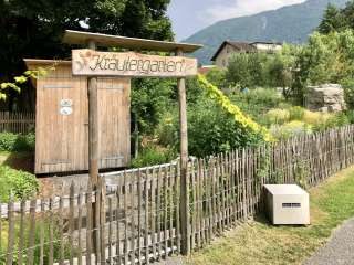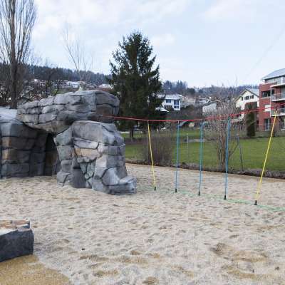 A children's playground with a large climbing pyramid, a beach volleyball court, a skating park with halfpipe, a bowling alley, a small football pitch, a barbecue area and various seating areas, a medicinal herb educational garden and a special fountain (called the "hill jumper") are arranged around a central pavilion in the Weiherring.