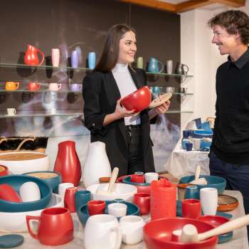 While you enjoy the finest coffee roasted in Liechtenstein and other regional drinks and products, you can look through the windows into the production facilities and watch, for example, how the cup from which you drink the mineral water is made or how the ceramic painters "wield their brushes".