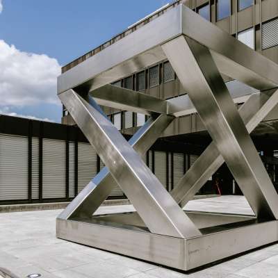 These letter formations can be up to five meters high, yet they still encircle the cube. When you look at the Z cube, you notice that the shaft of the letter that connects the upper and lower crossbars runs "wrong": instead of running from top right to bottom left, it connects top left to bottom right. The Z is therefore drawn mirror-inverted. However, if you look through the sculpture to the opposite side of the cube, you can see the letter Z spelled correctly. The front of the cube thus shows the back of the letter, the letter is written on the inside of the cube, and only when you stand in the center of the cube does the sign make sense.